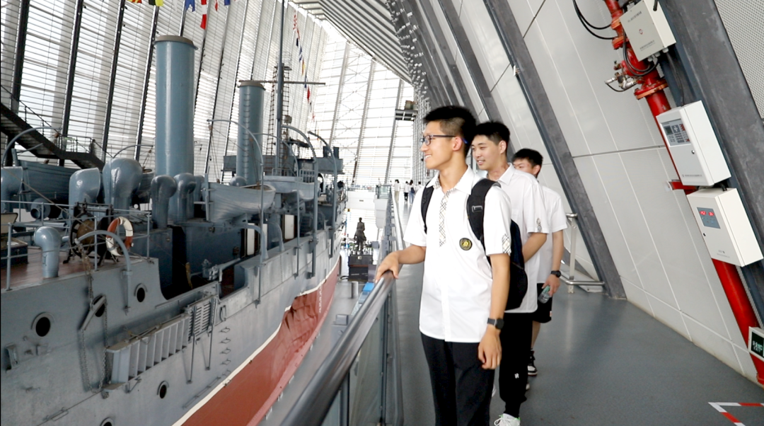 儀式結(jié)束后,同學(xué)們?cè)谥猩脚炦M(jìn)行參觀學(xué)習(xí)。在展廳中,透過珍貴的文物和視覺震撼的多媒體展陳,同學(xué)們了解了中山艦經(jīng)歷的曲折航程和創(chuàng)立的不朽功績(jī),也重溫了一段段鐵血悲歌的革命歷史,深切感受到了抗日英烈為實(shí)現(xiàn)國(guó)家獨(dú)立和民族解放奮勇捐軀的革命精神,強(qiáng)烈地激發(fā)了同學(xué)們的使命感和愛國(guó)熱情。
