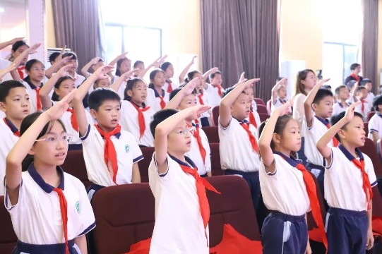 在鮮艷的隊旗下,新隊員們高舉右拳,在大隊輔導(dǎo)員鄒佳佳老師的帶領(lǐng)下莊嚴宣誓:“時刻準備著,為共產(chǎn)主義事業(yè)貢獻力量!”一句句鏗鏘有力的誓言,響徹整個會場;一張張稚嫩的臉龐,洋溢著莊嚴而激動的神情。