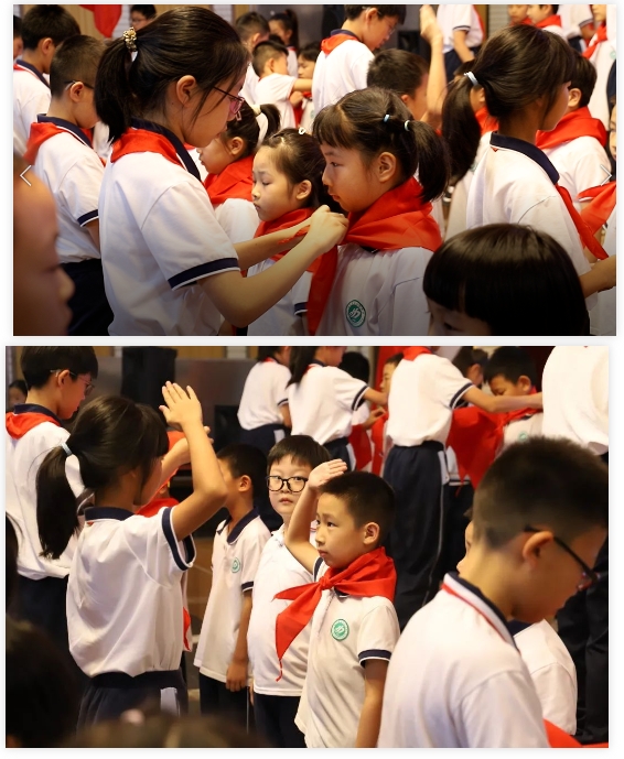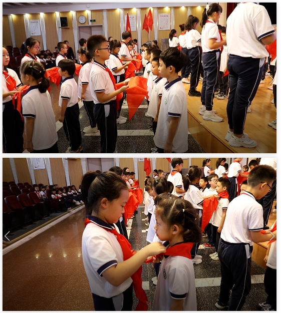 紅領(lǐng)巾是光榮的象征,紅領(lǐng)巾有著光榮的傳統(tǒng),伴隨著《紅領(lǐng)巾飄起來》的悠揚旋律,五年級的優(yōu)秀隊員們?yōu)槎昙壭玛爢T佩戴紅領(lǐng)巾。當(dāng)鮮艷的紅領(lǐng)巾飄揚在胸前,新隊員們臉上洋溢著激動與自豪。