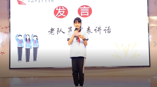 601班老隊員代表侯書晴鼓勵同學(xué)們學(xué)好文化知識,增強自身修養(yǎng),努力成為有理想、有道德、有文化、有紀律的新時代好少年。