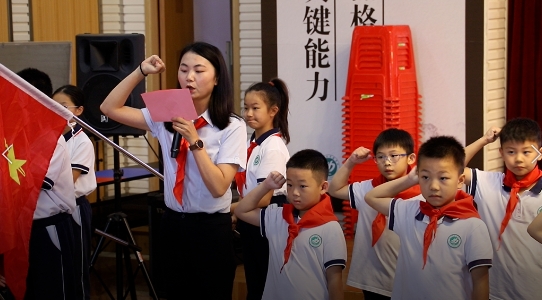 在大隊輔導(dǎo)員鄒老師的帶領(lǐng)下,全體少先隊員在隊旗下光榮呼號:時刻準備著!